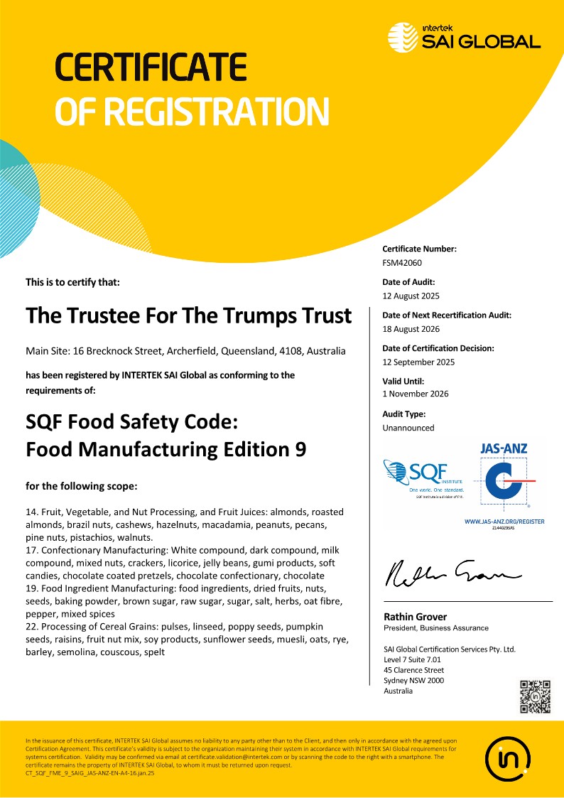 doy pouch packs. Trumps’ versatility with its manufacturing base enables us to further value add many popular products by oil roasting, dry roasting, blending and mixing products. Trumps not only processes and packs conventional products but is also proud to be Organic Certified with ACO Accreditation. Trumps and its product base over the 80 years of service to the industry have been at the forefront. We have been a market leader by adapting to ever-evolving and changing consumer requirements.